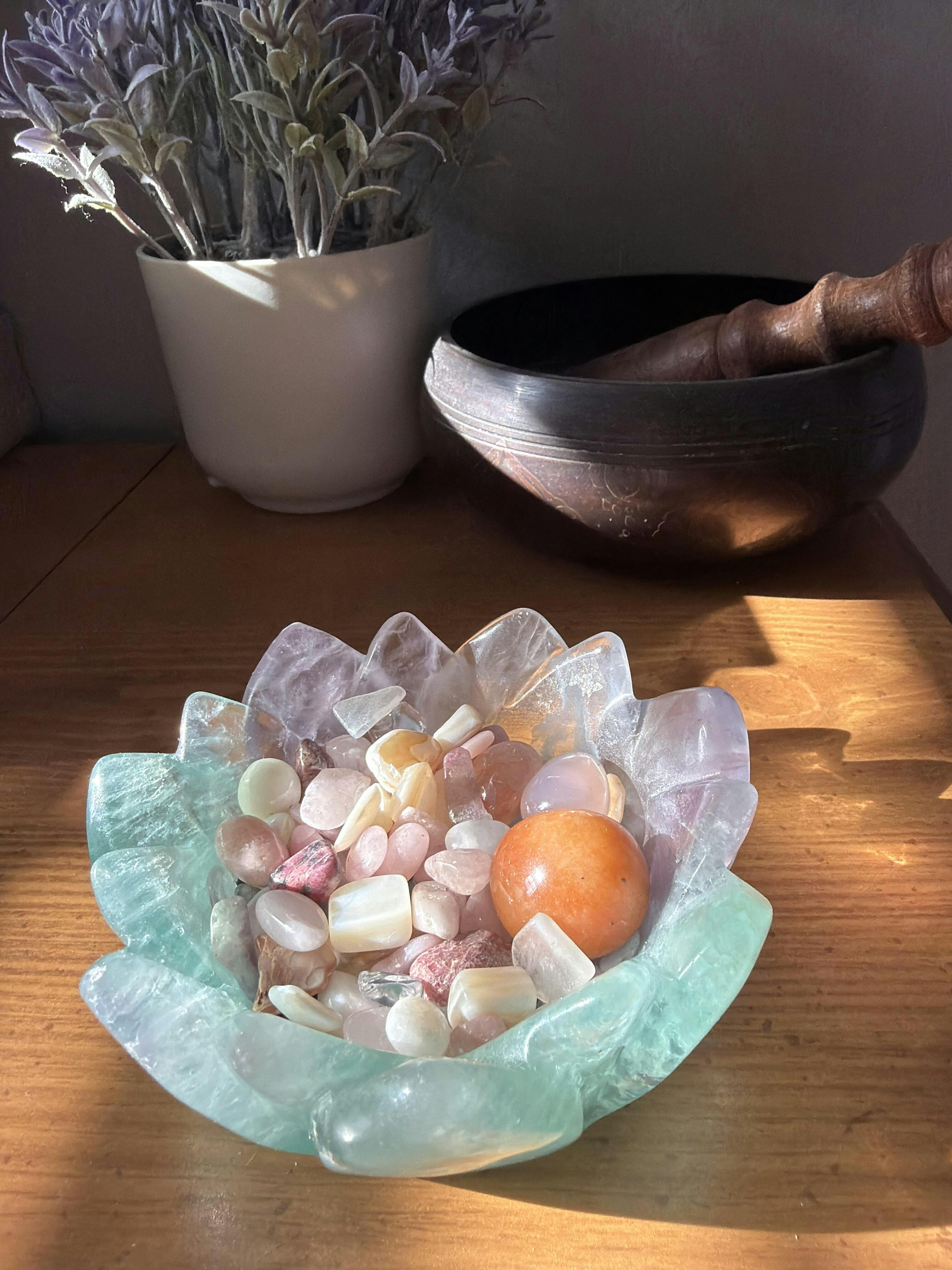 Flower bowl carvings are the perfect decorative bowls for holding crystal confetti, mini stones, jewellery, and small ritual items. Flower symbolism connects to growth, care, and gentle abundance. Great for altars, shelves, and intentional displays.