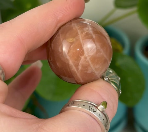 This enchanting sphere blends the uplifting energy of sunstone with the soothing calm of peach moonstone. The sunstoneās golden flashes bring joy, vitality, and confidence while the moonstoneās gentle glow encourages emotional balance and intuition. Itās a beautiful reminder that strength and softness can shine side by side.